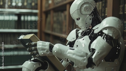 © shaiq, Fototapeta premium A Humanoid Robot Learning: An image of a humanoid robot engaged in a learning process, perhaps reading a book or analyzing data, showcasing the ability of AI systems to acquire knowledge and adapt