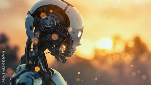 © PhornpimonNutiprapun, Fototapeta premium A Humanoid Robot Standing In Front Of A Sunset.