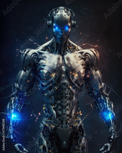 © Iaroslava, Naklejka premium A humanoid robot with a metallic silver body. Generative AI.