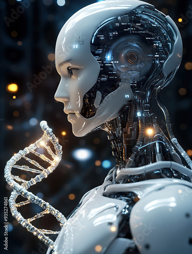 © 沈军 贡, Fototapeta premium A humanoid robot with an advanced AI chip in its head, holding and looking at the DNA double helix