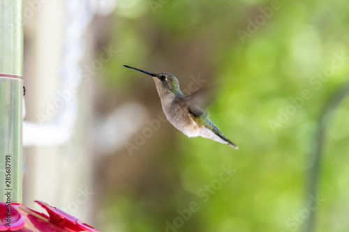 © Chaithanya, Obraz premium A humming bird drinking nectar from a bird feed on a hiking trail close to mountains in Salt Lake City, UT