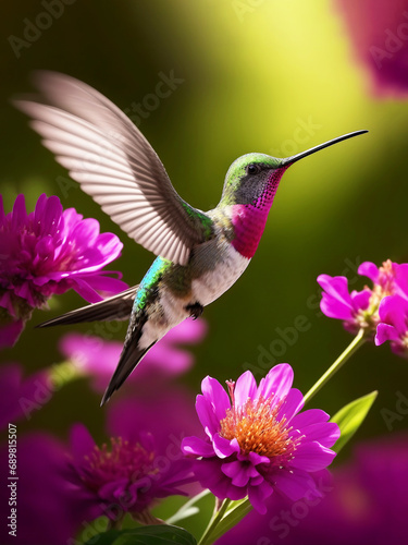 Fototapeta premium A hummingbird feeding on honey from a flower Vibrant color background, AI...
