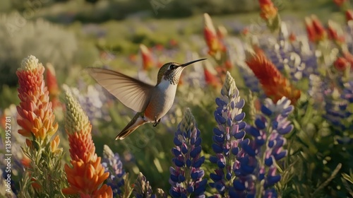 Fototapeta premium A hummingbird flies among colorful wildflowers in a field