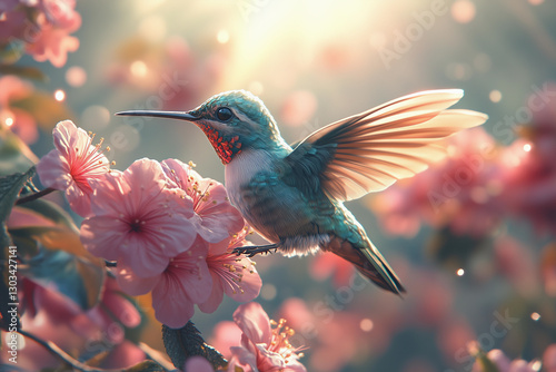 © AiArtVision, Fototapeta premium a hummingbird flying over a pink flower with a blue sky background and sun shining through the wings of the flower