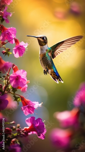 © sergio, Fototapeta premium A hummingbird flying through the air next to pink flowers. Generative AI.