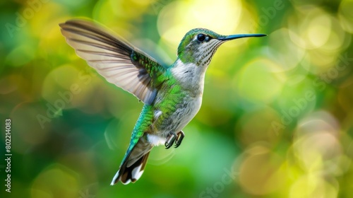 Fototapeta premium A hummingbird flying through the air with its wings spread wide
