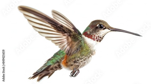 Fototapeta premium A hummingbird gracefully flaps its wings in flight against a pure white backdrop