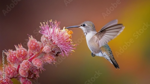 © BerkahStock, Fototapeta premium A hummingbird hovering near a vibrant flower, showcasing nature's beauty and pollination.