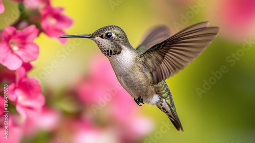 © kura, Obraz premium A Hummingbird Hovering Near Pink Flowers In A Beautiful Garden