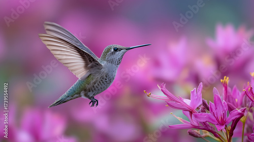 Fototapeta premium A hummingbird hovering near pink flowers, photorealistic, nature photography....