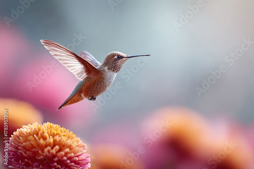 Obraz premium A hummingbird hovering near vibrant flowers, symbolizing natures beauty and delicate balance. Great for conveying freedom, joy, and connection to the natural world.