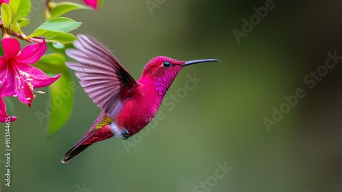 © Wall, Fototapeta premium A hummingbird hovers by a pink flower with green leaves; another pink bloom appears in the foreground, background softly blurred