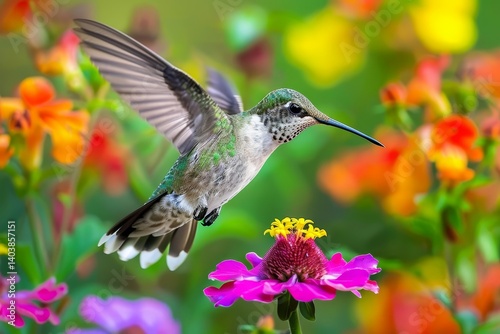 Naklejka premium A hummingbird hovers gracefully near a pink and yellow flower in a colorful garden, A hummingbird hovering gracefully near a vibrant cluster of flowers