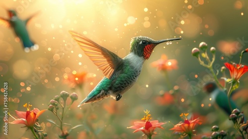 © Liana, Obraz premium A hummingbird hovers mid-air among vibrant flowers with sunlight speckles.