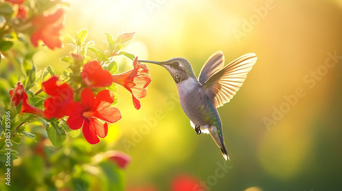 Fototapeta premium A hummingbird hovers near a bright red flower, sipping nectar in the warm...
