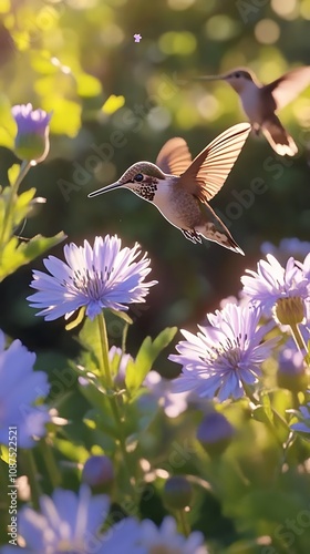 Fototapeta premium A hummingbird hovers over a blurry green summer background with wild purple...