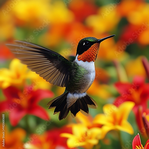© Duit, Fototapeta premium A hummingbird in flight amidst vibrant flowers