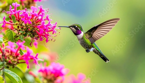 Fototapeta premium A hummingbird in flight, feeding from vibrant pink flowers
