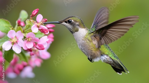 © iam, Fototapeta premium A hummingbird in flight, feeding on pink blossoms.