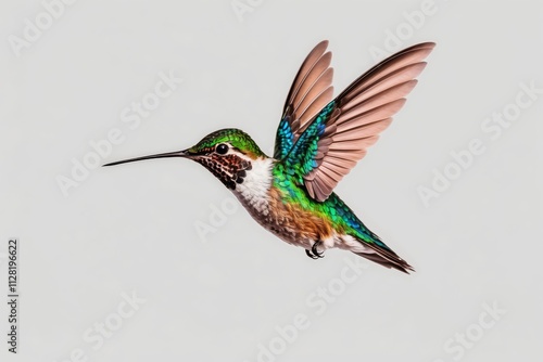 Fototapeta premium A hummingbird in flight, showcasing its iridescent plumage and long beak against a neutral background.