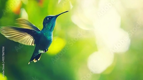 Fototapeta premium A hummingbird in flight, wings open wide and beak outstretched