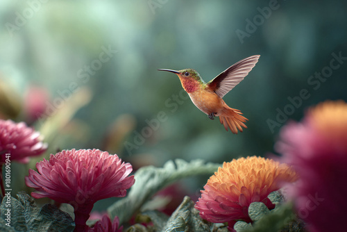 © SolaruS, Fototapeta premium A hummingbird in flight, wings spread, hovers near vibrant flowers. Symbolizes beauty, nature, and freedom. Use for spring, summer, or ecological themes.