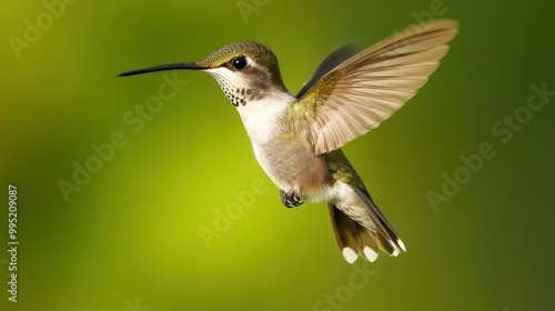 Fototapeta premium A hummingbird in flight with blurred green background, showcasing its vibrant...