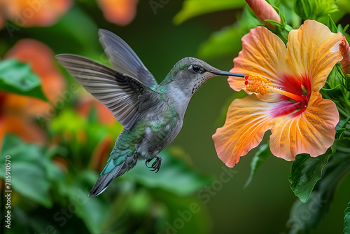 Naklejka premium A hummingbird in mid-flight feeding from a vibrant hibiscus flower, captured in stunning detail against a lush green backdrop
