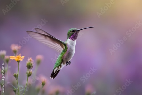 © Toseef, Fototapeta premium A hummingbird in mid flight with wildflowers sprouting from its back, Ai generated