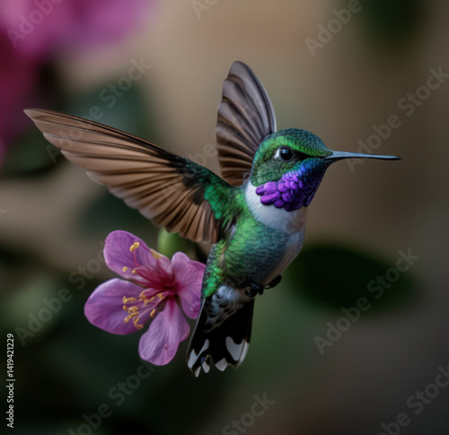 © britaseifert, Obraz premium A hummingbird in vibrant flies near flower petals