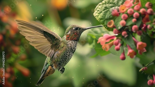 © zenith, Naklejka premium A hummingbird is flying over a bush with red berries