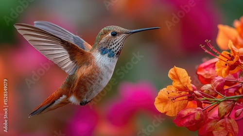 © Formoney, Fototapeta premium A hummingbird is flying over a flower with pink petals. The bird is brown and white, and it is in the air. The flower is surrounded by other flowers, and the scene is colorful and lively