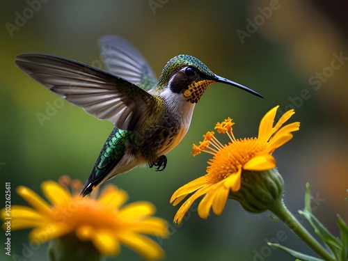© designer master 06, Fototapeta premium A hummingbird is flying over some flowers and the bird is flying away