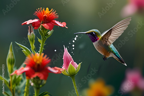 © Md saijul islam, Naklejka premium A hummingbird is flying over some pink flowers
