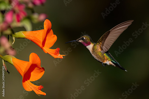© ruang, Fototapeta premium A hummingbird is flying to a flower, close up. AI generative image.