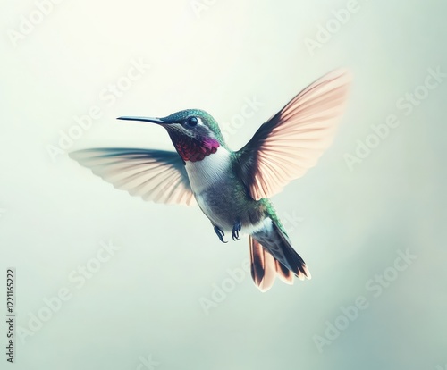 Fototapeta premium A hummingbird is gracefully flying in the air with its wings open