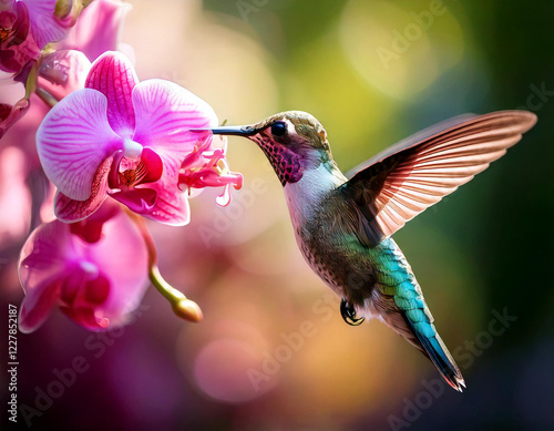 © Jakob, Obraz premium A hummingbird is perched on a pink flower. The bird is drinking nectar from the flower
