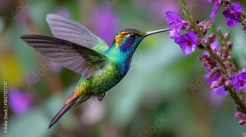 Obraz premium A hummingbird is perched on a purple flower. The bird is green and blue in...