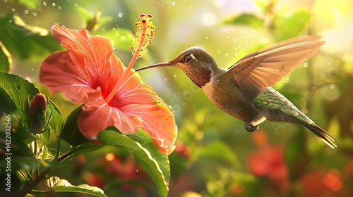 © Maham, Fototapeta premium A hummingbird perched delicately on a hibiscus flower, sipping nectar with its slender beak.