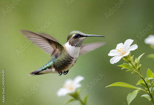 © Pod, Naklejka premium A hummingbird pollinating a white flower against a blurred green background