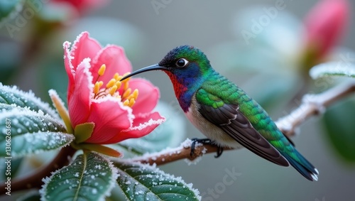 Fototapeta premium A hummingbird rests on a rhododendron bud during winter, with frost covering...