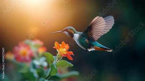 © Petchladda, Obraz premium A hummingbird's wings in motion as it hovers above a flower