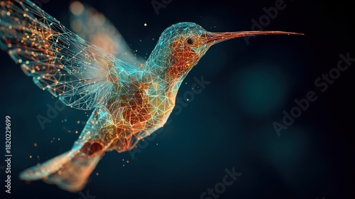Obraz premium A hummingbird with a colorful, geometric pattern on its wings, flying against...