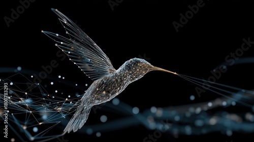 Fototapeta premium A hummingbird with intricate patterns on its wings and body, flying against a black background with a network of lines and dots, creating a sense of motion and energy.