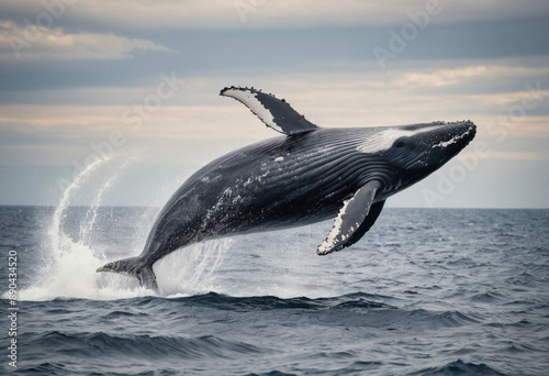 Fototapeta premium A humpback whale breaching out of the water in a dramatic ocean scene.