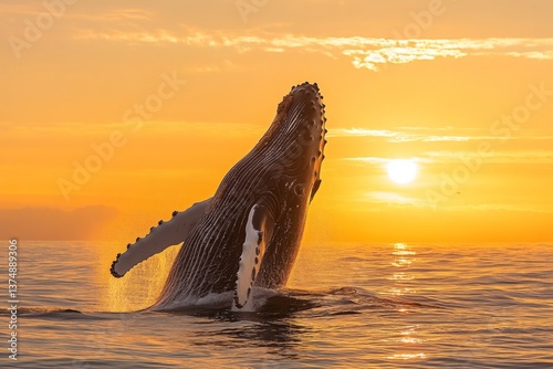Fototapeta premium A humpback whale leaps from the calm water against a vibrant sunset,...