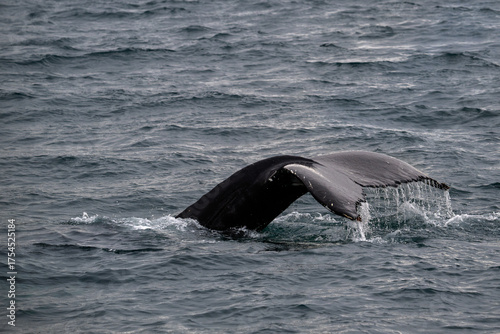 © Tom, Obraz premium A humpback whale’s tail breaks the surface.