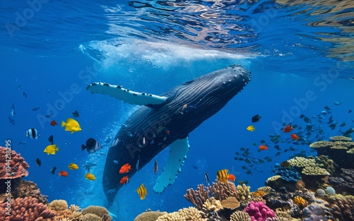 Fototapeta premium A humpback whale swims over a coral reef with colorful fish.