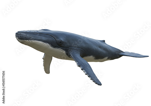 © Te, Naklejka premium A humpback whale swims viewed from below its grey body contrasting against a stark black background