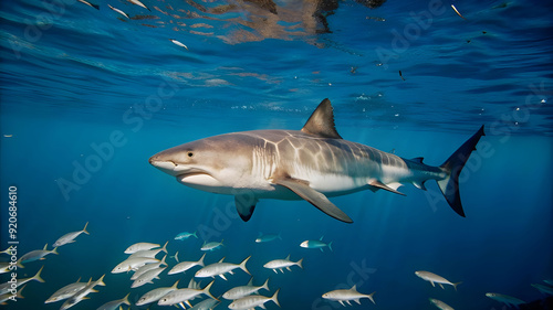 © MuhammadImran, Fototapeta premium a hungry great white shark patrolling the clear